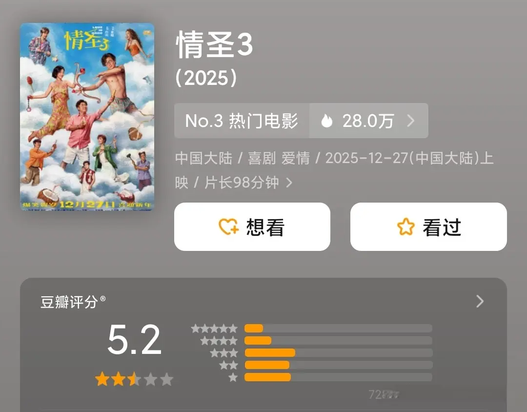 股莘配资APP下载 《情圣3》豆瓣评分5.2 总票房预测降至4000万元
